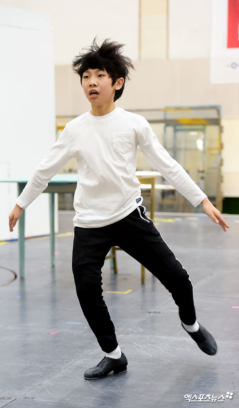 [엑스포츠뉴스 서예진 기자] 24일 오전 서울 중구 예장동 남산창작센터에서 진행된 뮤지컬 ‘빌리 엘리어트’ 연습실 공개 현장에 참석한 아역배우 김현준이 멋진 시연을 선보이고 있다.