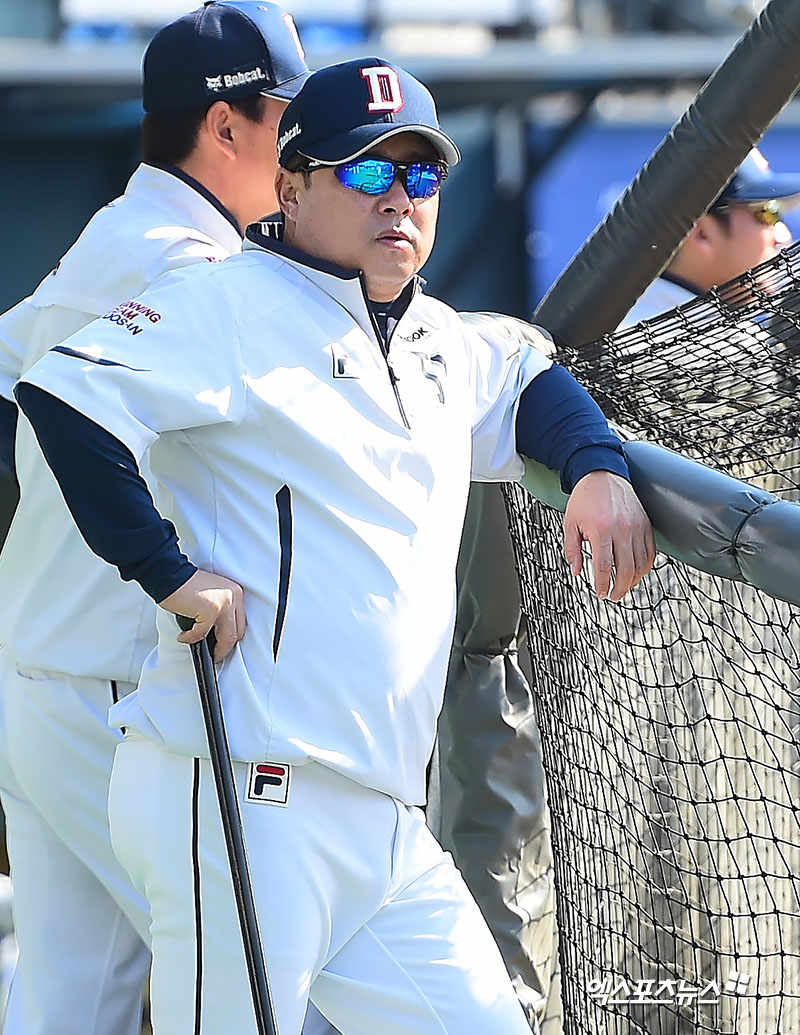 [엑스포츠뉴스 김한준 기자] 28일 오후 서울 송파구 잠실야구장에서 열리는 '2017 타이어뱅크 KBO리그 포스트시즌' KIA 타이거즈와 두산 베어스의 한국시리즈 3차전 경기, 두산 김태형 감독이 선수들의 훈련 모습을 지켜보고 있다.