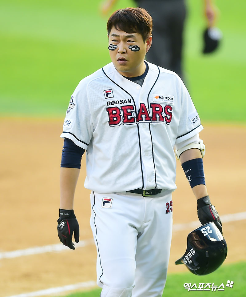 [엑스포츠뉴스 김한준 기자] 28일 오후 서울 송파구 잠실야구장에서 열린 '2017 타이어뱅크 KBO리그 포스트시즌' KIA 타이거즈와 두산 베어스의 한국시리즈 3차전 경기, 8회말 2사 1,3루 두산 양의지가 우익수 플라이로 아웃된 후 아쉬워하고 있다.