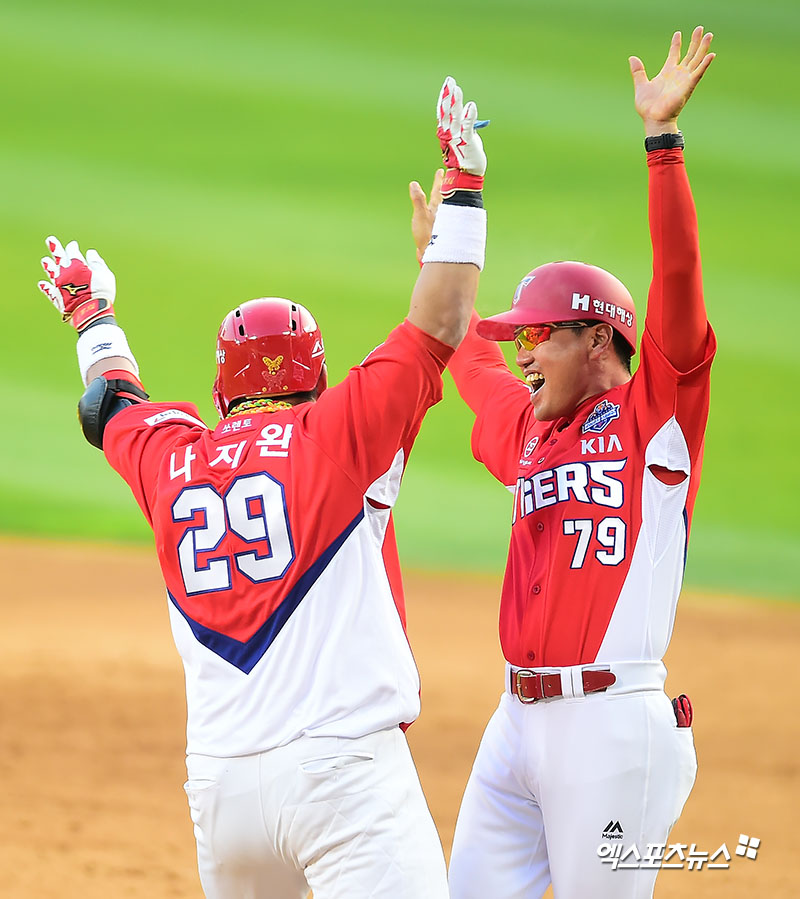[엑스포츠뉴스 김한준 기자] 28일 오후 서울 송파구 잠실야구장에서 열린 '2017 타이어뱅크 KBO리그 포스트시즌' KIA 타이거즈와 두산 베어스의 한국시리즈 3차전 경기, 9회초 2사 3루 KIA 나지완이 투런 홈런을 날린 후 김태룡 코치와 하이파이브를 하고 있다.