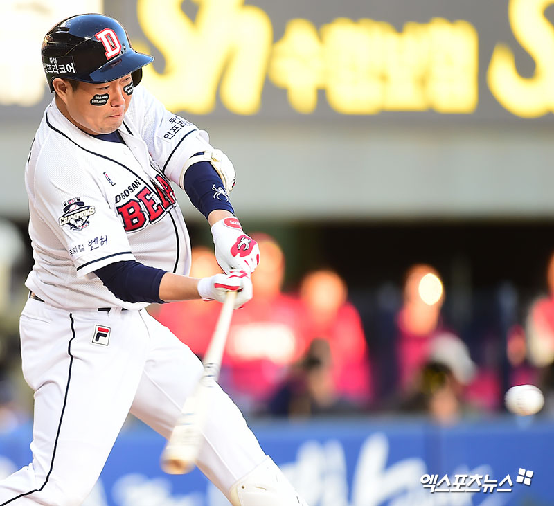 [엑스포츠뉴스 김한준 기자] 29일 오후 서울 송파구 잠실야구장에서 열린 '2017 타이어뱅크 KBO리그 포스트시즌' KIA 타이거즈와 두산 베어스의 한국시리즈 4차전 경기, 8회말 1사 1,2루 두산 양의지가 타격을 하고 있다. 결과는 유격수 라인드라이브 아웃.