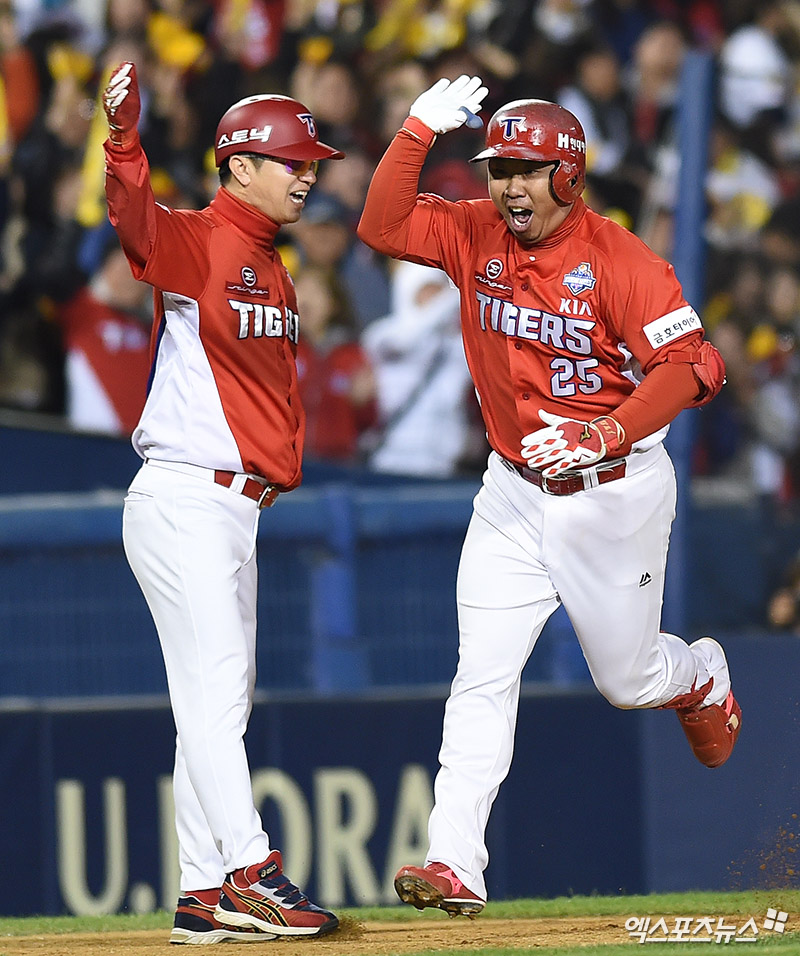 [엑스포츠뉴스 박지영 기자] 30일 오후 서울 송파구 잠실야구장에서 열린 '2017 타이어뱅크 KBO리그 포스트시즌' KIA 타이거즈와 두산 베어스의 한국시리즈 5차전 경기, 3회초 2사 만루 KIA 이범호가 만루홈런을 터뜨린 뒤 베이스를 돌며 김종국 코치와 하이파이브를 하고 있다.