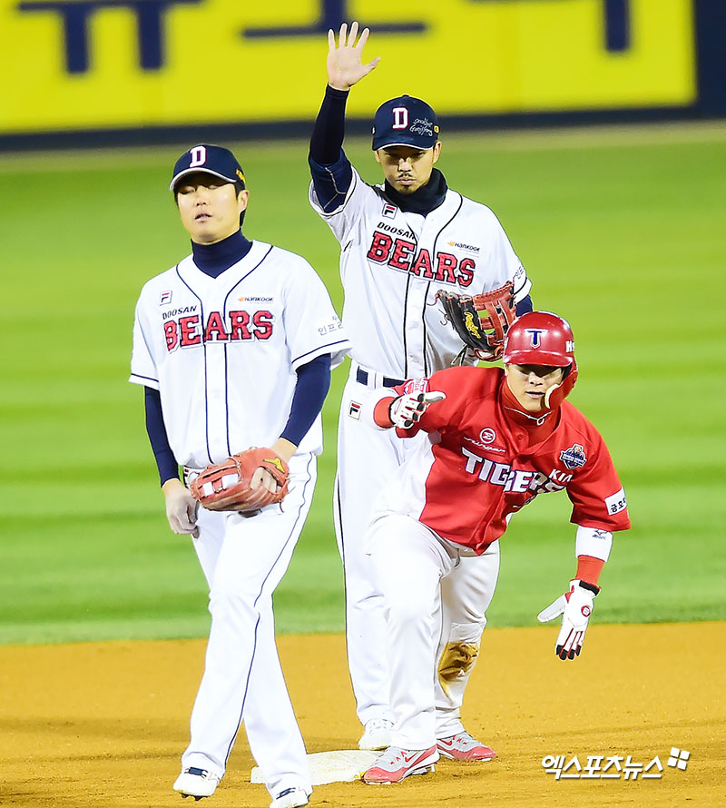 [엑스포츠뉴스 김한준 기자] 30일 오후 서울 송파구 잠실야구장에서 열린 '2017 타이어뱅크 KBO리그 포스트시즌' KIA 타이거즈와 두산 베어스의 한국시리즈 5차전 경기, 6회초 1사 1루 KIA 김선빈이 두산 함덕주의 폭투때 2루까지 진루하고 있다.