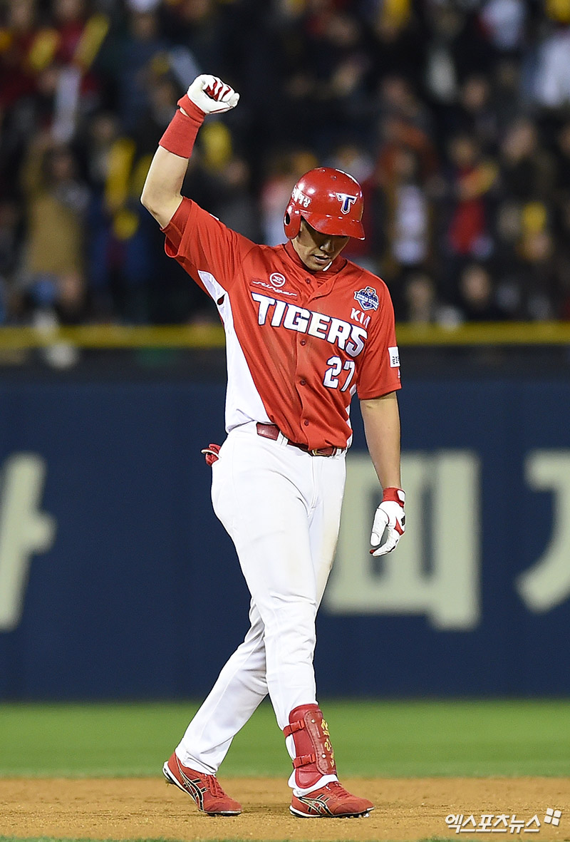 [엑스포츠뉴스 박지영 기자] 30일 오후 서울 송파구 잠실야구장에서 열린 '2017 타이어뱅크 KBO리그 포스트시즌' KIA 타이거즈와 두산 베어스의 한국시리즈 5차전 경기, 6회초 1사 2루 KIA 이명기가 적시 2루타를 때려낸 뒤 2루에서 기쁨을 표현하고 있다.