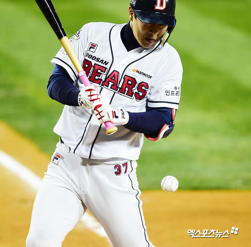 [엑스포츠뉴스 김한준 기자] 30일 오후 서울 송파구 잠실야구장에서 열린 '2017 타이어뱅크 KBO리그 포스트시즌' KIA 타이거즈와 두산 베어스의 한국시리즈 5차전 경기, 7회말 무사 2,3루 두산 박건우가 사구에 맞고 있다.