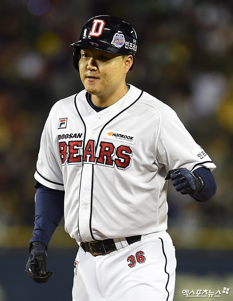 [엑스포츠뉴스 박지영 기자] 30일 오후 서울 송파구 잠실야구장에서 열린 '2017 타이어뱅크 KBO리그 포스트시즌' KIA 타이거즈와 두산 베어스의 한국시리즈 5차전 경기, 7회말 무사 만루 두산 오재일이 2타점 적시타를 때려낸 뒤 1루에서 주먹을 쥐어보이고 있다.