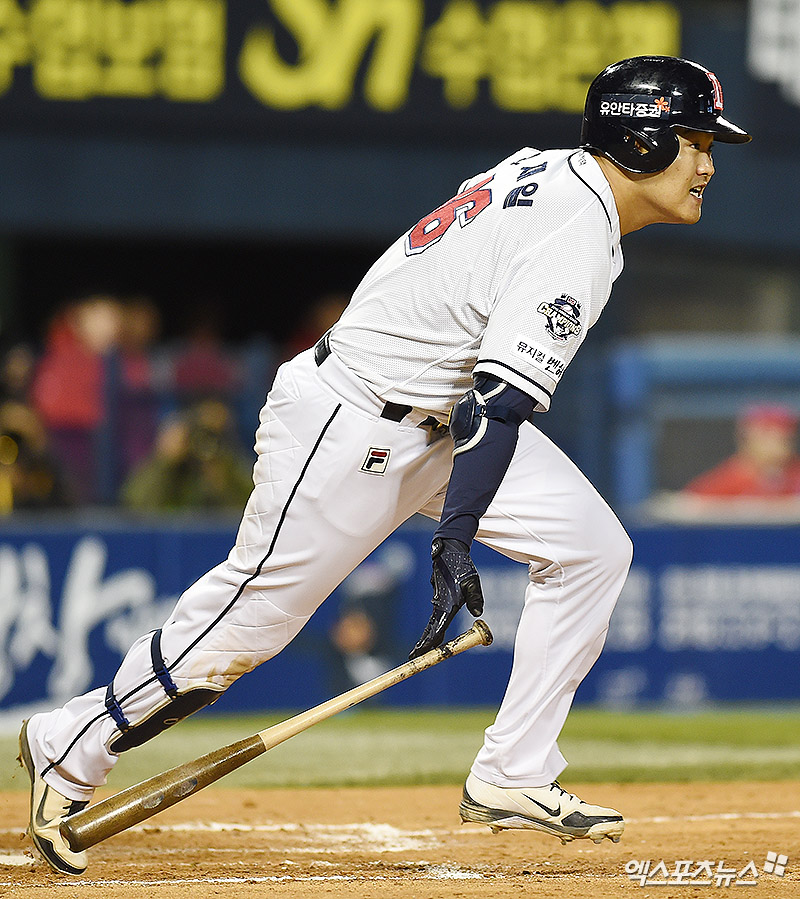 [엑스포츠뉴스 박지영 기자] 30일 오후 서울 송파구 잠실야구장에서 열린 '2017 타이어뱅크 KBO리그 포스트시즌' KIA 타이거즈와 두산 베어스의 한국시리즈 5차전 경기, 7회말 무사 만루 두산 오재일이 2타점 적시타를 때려내고 있다.