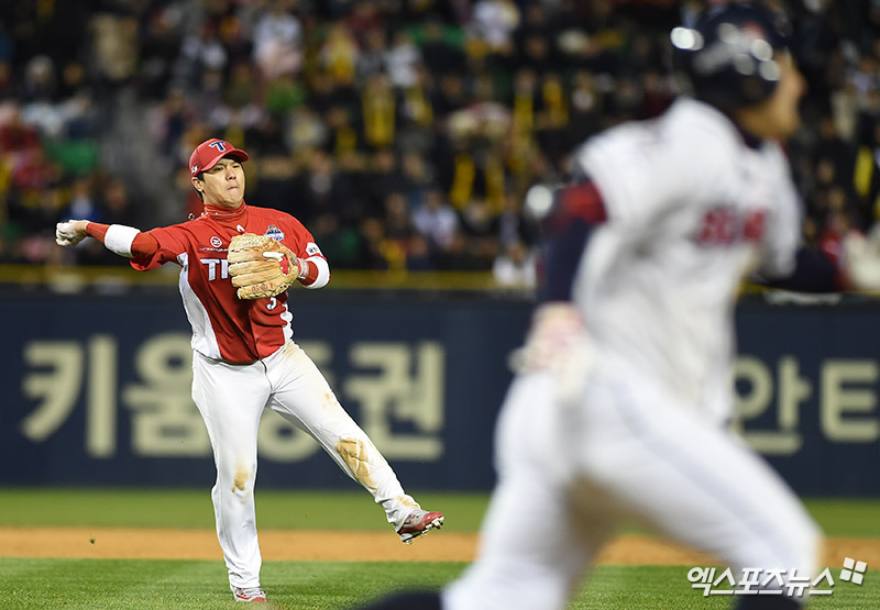 [엑스포츠뉴스 박지영 기자] 30일 오후 서울 송파구 잠실야구장에서 열린 '2017 타이어뱅크 KBO리그 포스트시즌' KIA 타이거즈와 두산 베어스의 한국시리즈 5차전 경기, 7회말 1사 만루 KIA 김선빈이 두산 최주환의 타구를 잡아 1루로 송구하고 있다. 결과는 아웃. 비디오 판독 후 원심 유지.