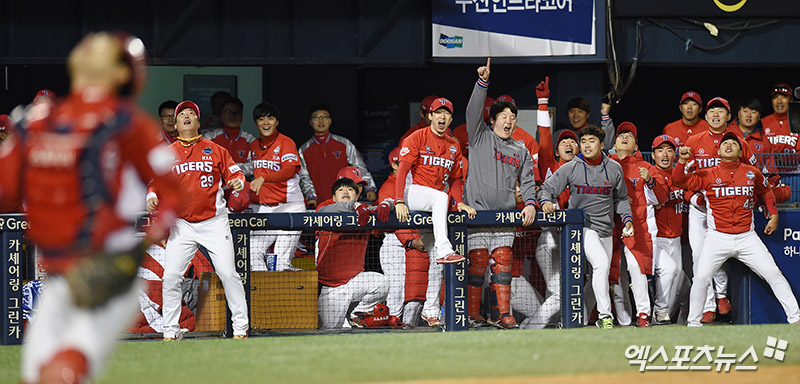 9회말 2사 KIA 선수단이 두산 김재호의 타구를 보며 더그아웃에서 환호하고 있다.
