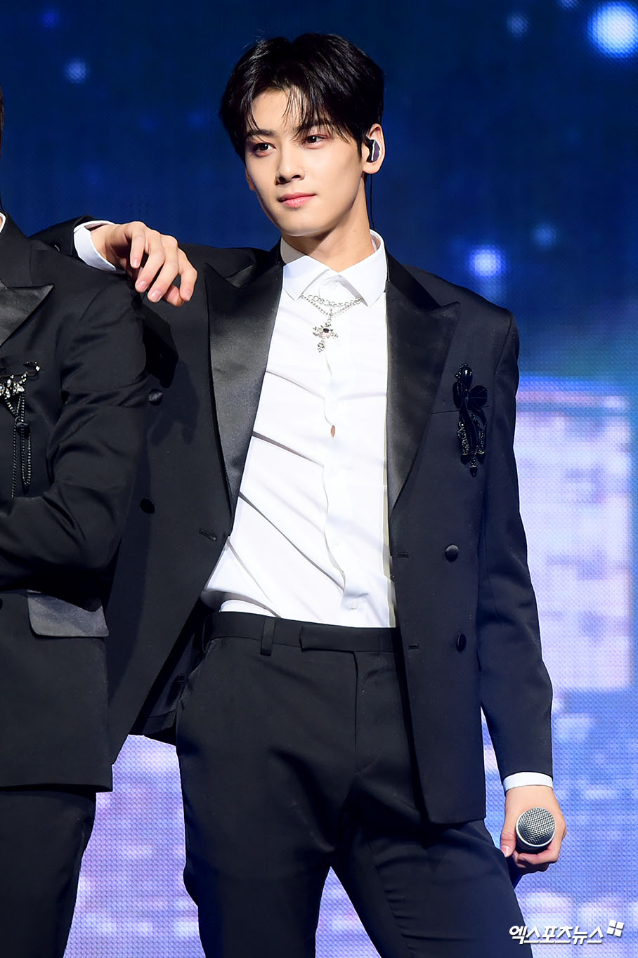 이날 쇼케이스에 참석한 아스트로 차은우가 멋진 무대를 선보이고 있다.