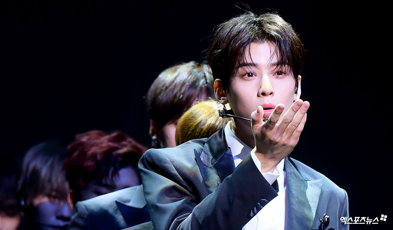 이날 쇼케이스에 참석한 아스트로 차은우가 멋진 무대를 선보이고 있다.