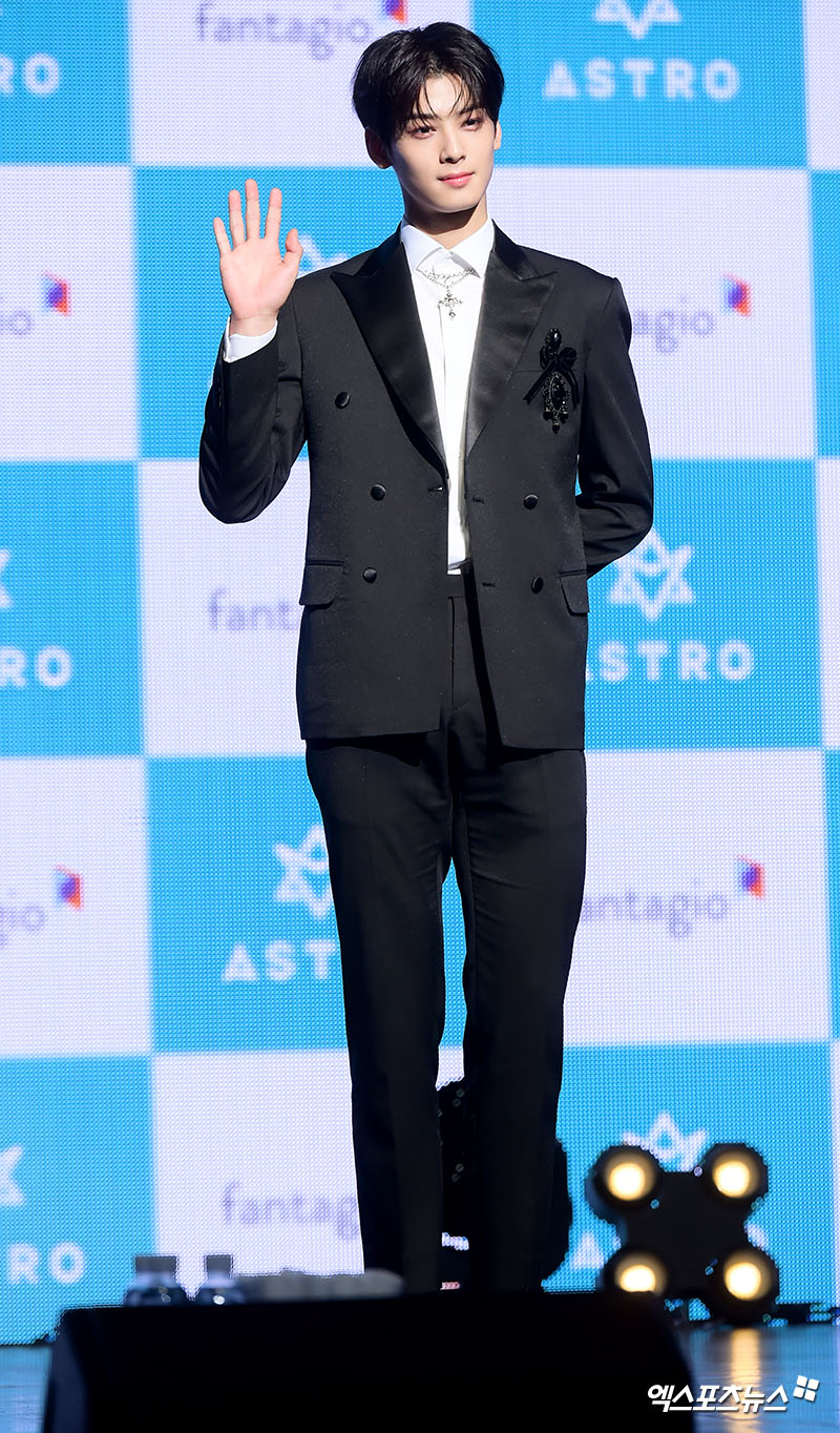이날 쇼케이스에 참석한 아스트로 차은우가 포토타임을 갖고 있다.