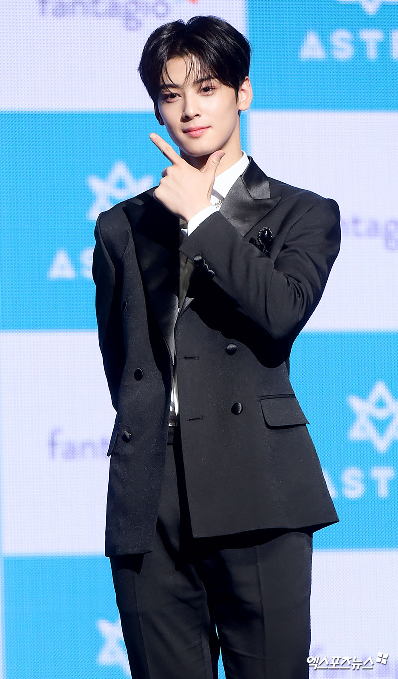 이날 쇼케이스에 참석한 아스트로 차은우가 포토타임을 갖고 있다.