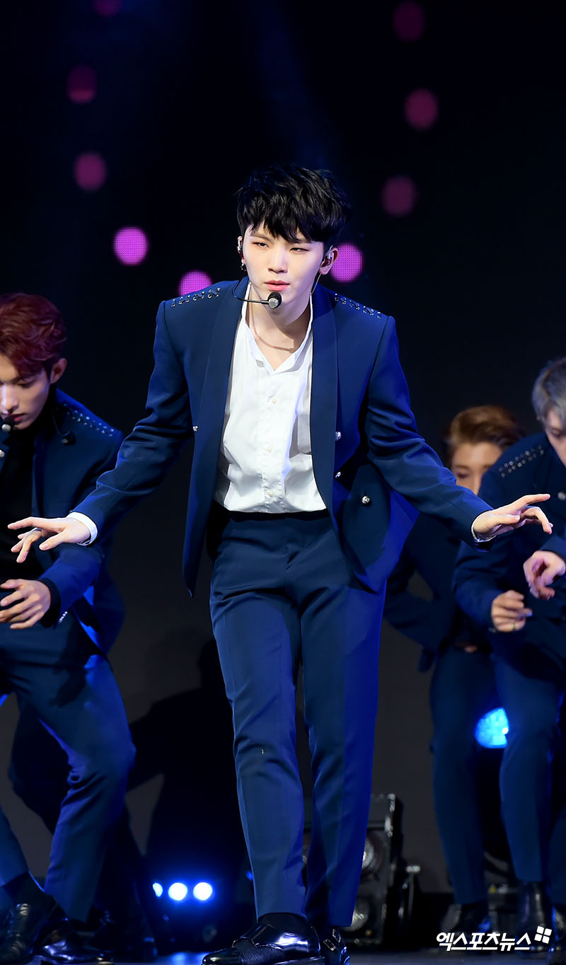 이날 쇼케이스에 참석한 세븐틴 우지가 멋진 무대를 선보이고 있다.