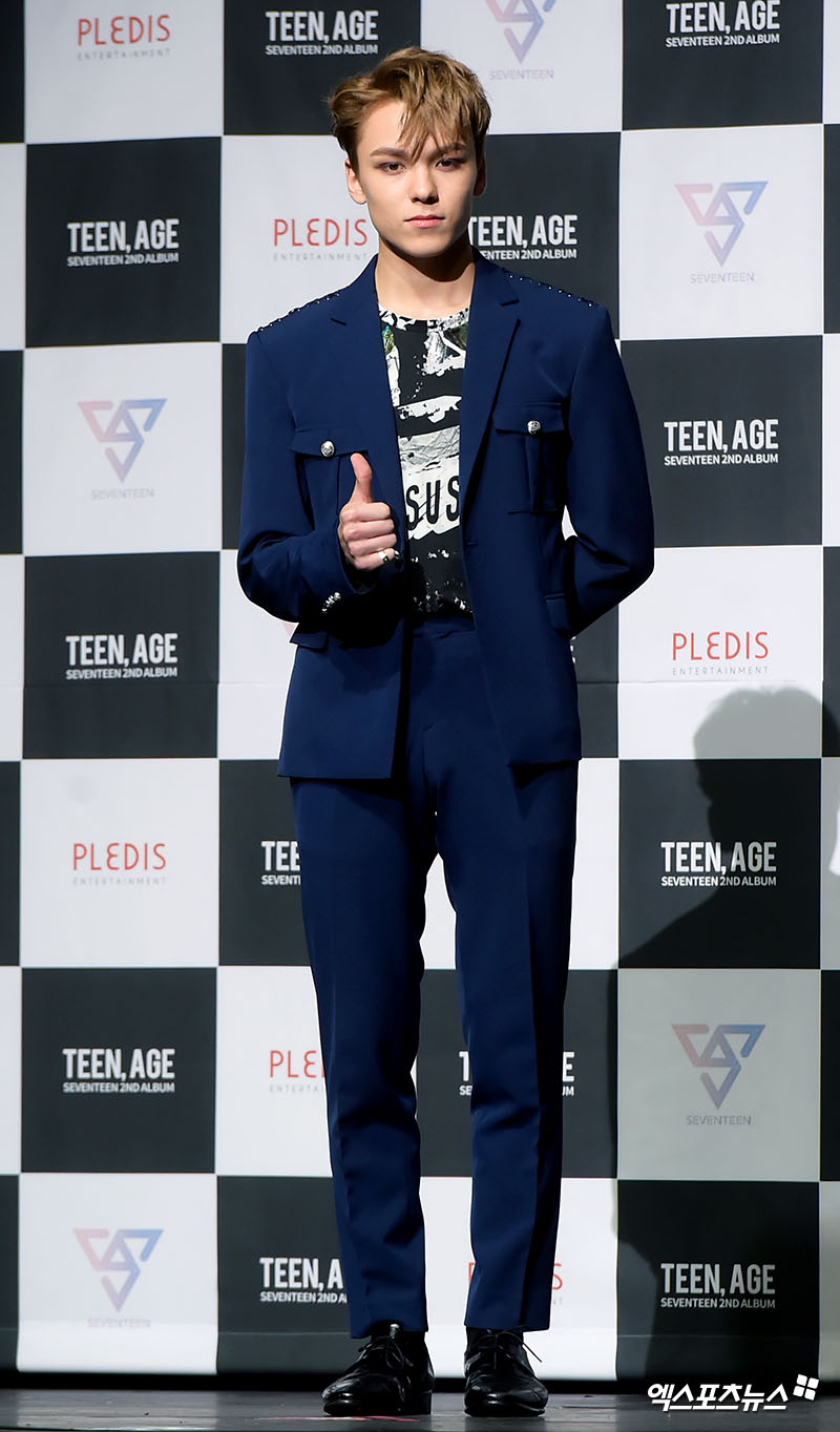 이날 쇼케이스에 참석한 세븐틴 버논이 포토타임을 갖고 있다.