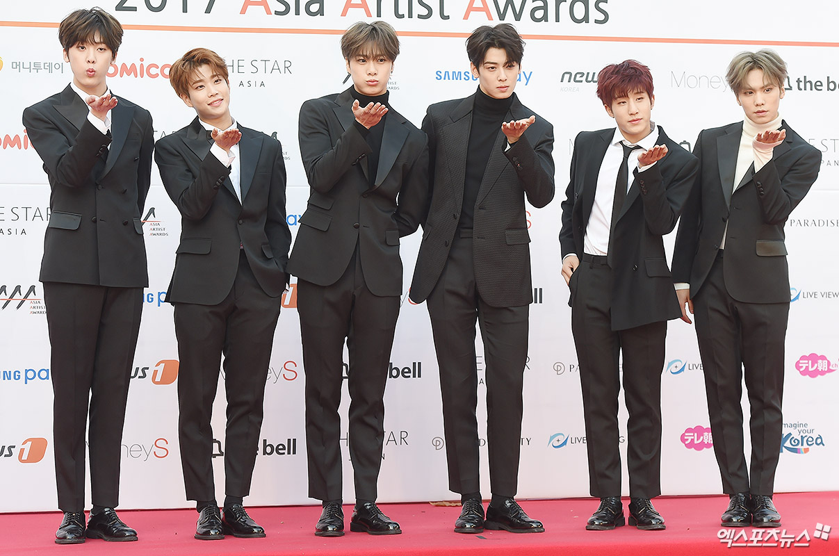 [엑스포츠뉴스 박지영 기자] 15일 오후 서울 송파구 잠실실내체육관에서 열린 '2017 Asia Artist Awards’(2017 아시아 아티스트 어워즈, ’AAA’) 레드카펫 행사에 참석한 아스트로가 포토타임을 갖고 있다.