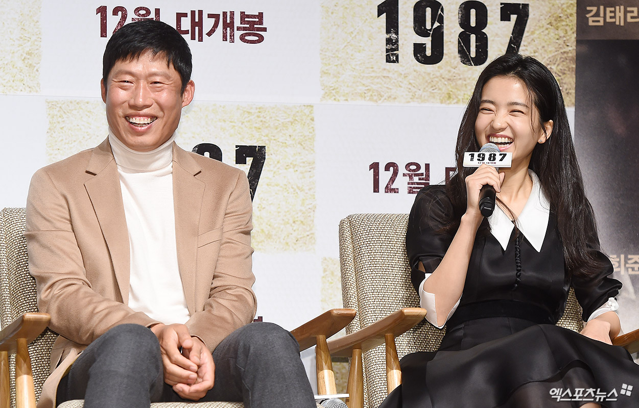 [엑스포츠뉴스 박지영 기자] 22일 오전 서울 신사동 CGV 압구정점에서 열린 영화 '1987'(감독 장준환) 제작보고회에 참석한 배우 유해진과 김태리가 웃음을 터뜨리고 있다.