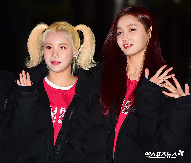 뮤직뱅크 리허설에 참석한 모모랜드 주이와 연우가 포즈를 취하고 있다.