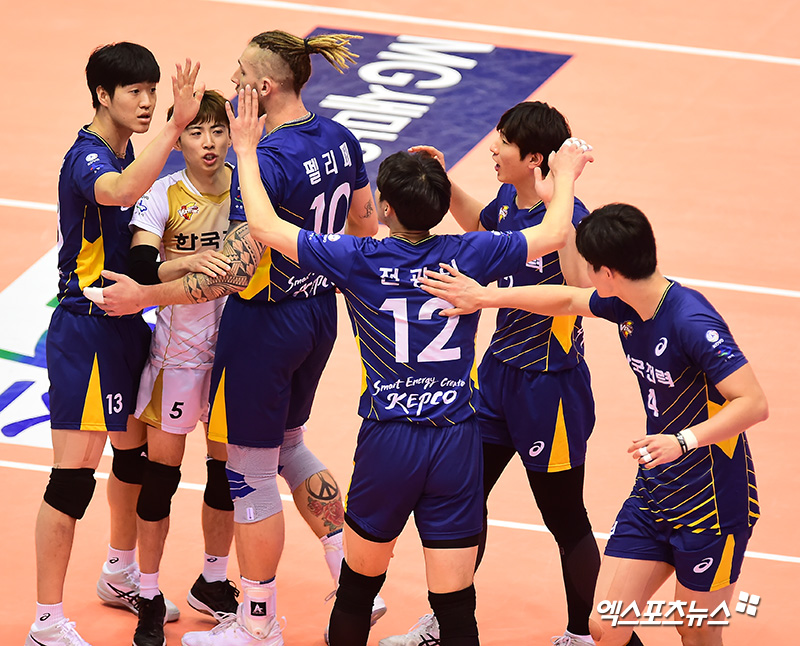 한국전력 선수들이 득점에 성공한 후 기뻐하고 있다.