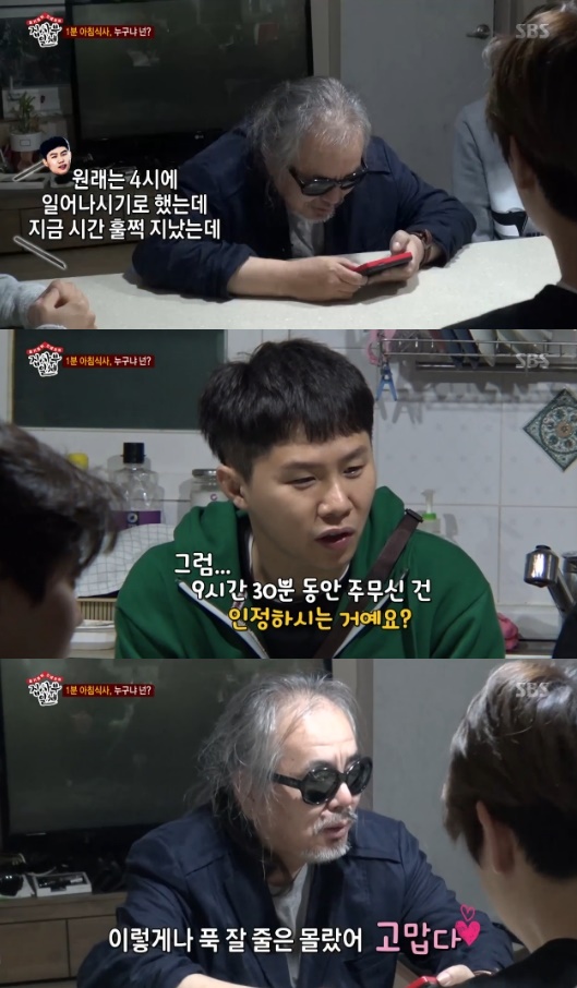 늦게 일어나고 태연한 전인권의 모습에 양세형은 "원래는 4시에 일어나시기로 했는데, 지금 시간 훌쩍 지났는데"라고 말을 꺼냈다. 이에 전인권은 "할 수 없는 거지 뭐"라며 민망해했고, 양세형은 "그럼 9시간 30분 동안 인정하시는 거냐"라고 물었다.