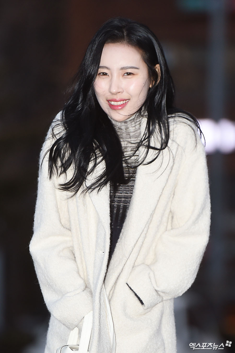리허설에 참석한 가수 선미가 출근길에 포토타임을 갖고 있다.