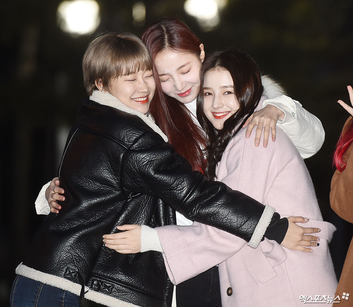 리허설에 참석한 모모랜드 혜빈, 연우, 낸시가 출근길에 포토타임을 갖고 있다.