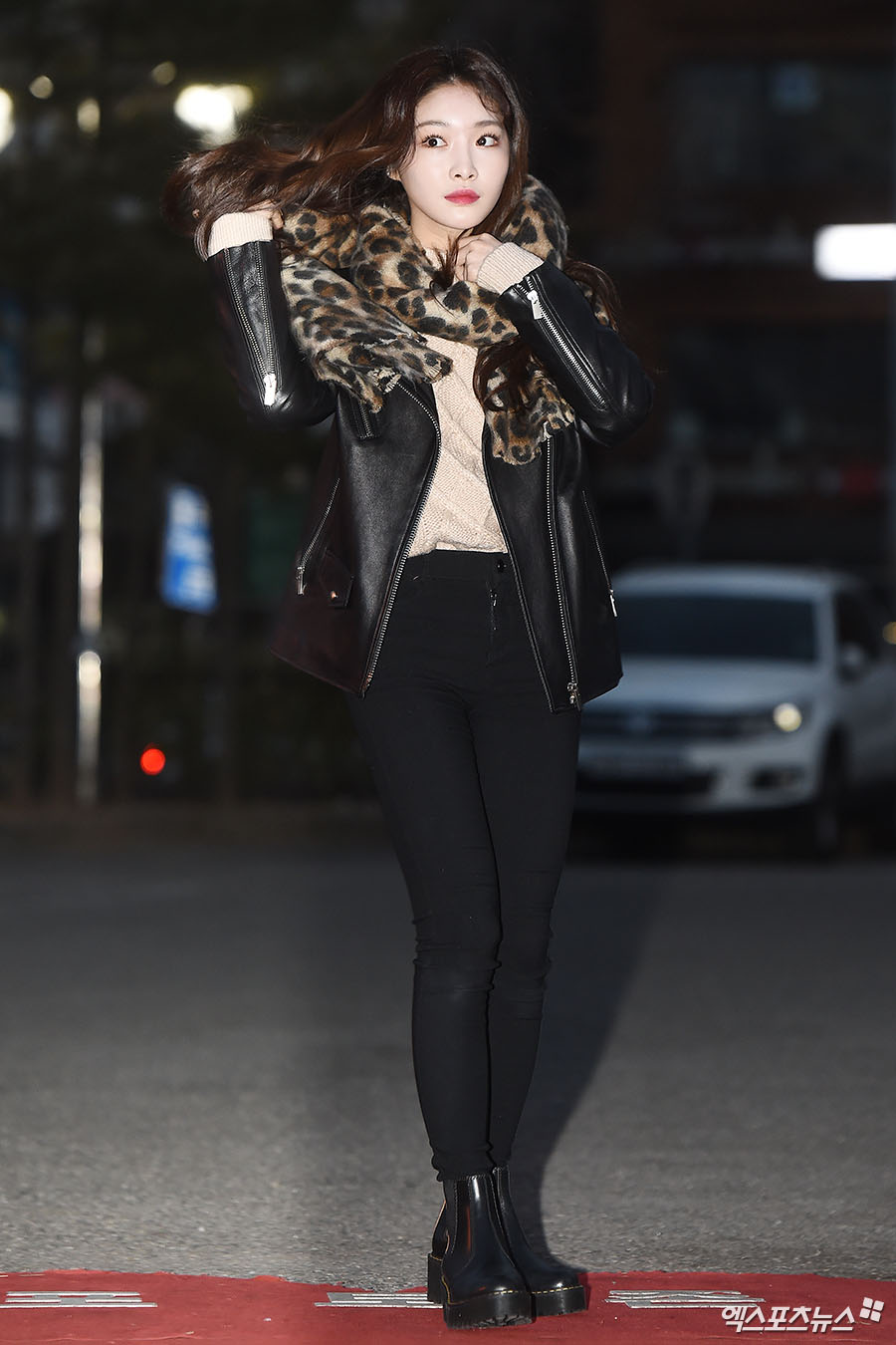 리허설에 참석한 가수 청하가 출근길에 포토타임을 갖고 있다.