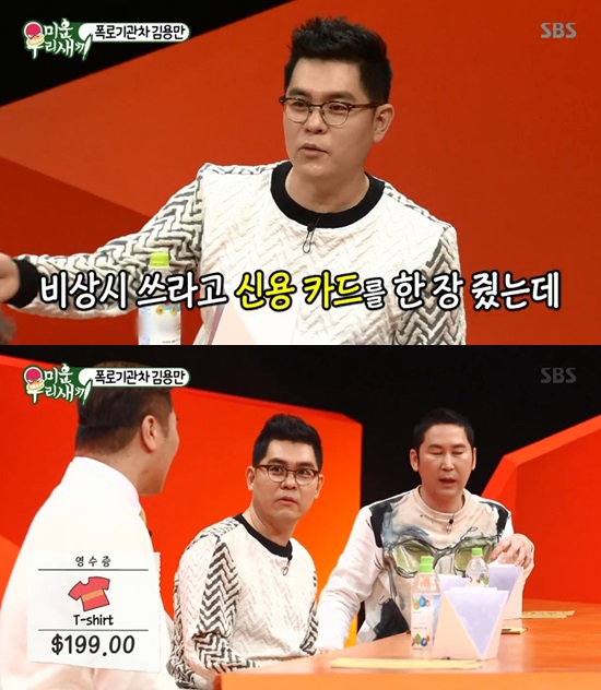 이날 신동엽은 김용만의 아들이 버클리 음대 재학중이라고 밝혔다. 김용만은 "카드를 줬다. 뭘 먹고 어디 갔는지 알지 않냐. 가끔 말도 안되는 금액이 찍혀있다. 티를 하나 샀는데 20만원짜리를 샀다"라며 일화를 공개했다.
