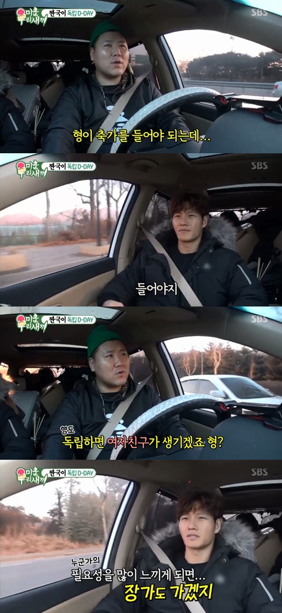 이날 김종국은 "다른 놈들 축가해주기도 지겹다"라며 솔직하게 털어놨다. 이에 매니저는 "형이 축가를 들어야 한다. 독립하면 여자친구 생기지 않겠냐"라며 맞장구쳤다.