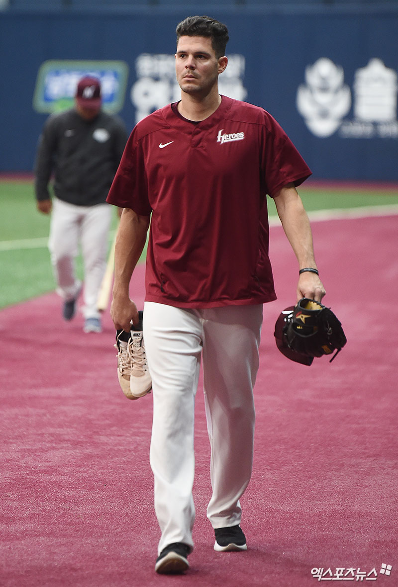 [엑스포츠뉴스 박지영 기자] 24일 오후 고척스카이돔에서 열리는 '2018 신한은행 MY CAR KBO리그' 한화 이글스와 넥센 히어로즈의 개막전 경기에 앞서 넥센 브리검이 훈련을 마치고 더그아웃으로 향하고 있다.