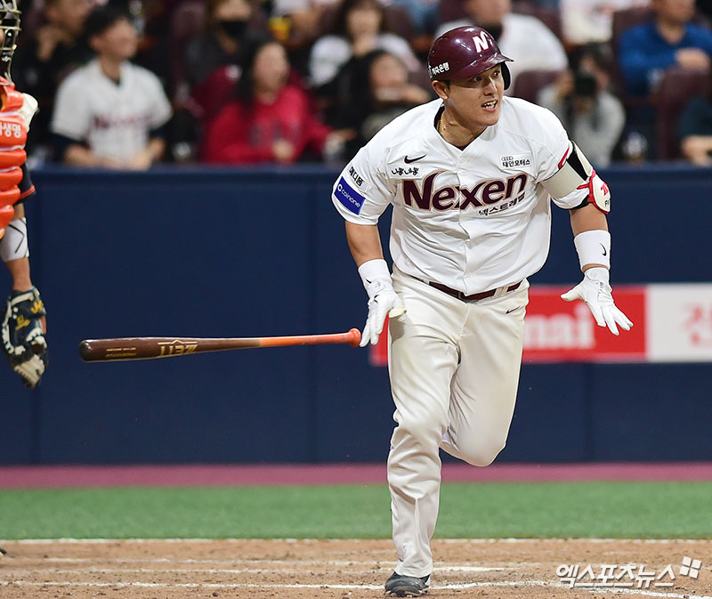 [엑스포츠뉴스 박지영 기자] 24일 오후 고척스카이돔에서 열린 '2018 신한은행 MY CAR KBO리그' 한화 이글스와 넥센 히어로즈의 개막전 경기, 5회말 1사 2루 넥센 박동원이 적시타를 때려내고 있다.