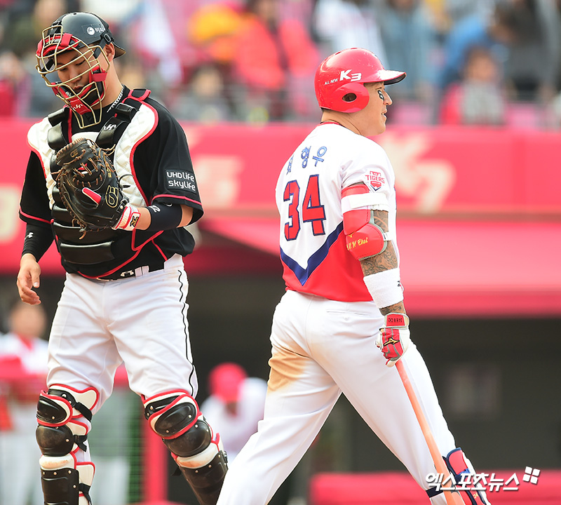 [엑스포츠뉴스 광주, 김한준 기자] 24일 오후 광주-기아 챔피언스필드에서 열린 '2018 신한은행 MY CAR KBO리그' kt 위즈와 KIA 타이거즈의 개막전 경기, 6회말 2사 1루 KIA 최형우가 삼진을 당한 후 아쉬워하고 있다.