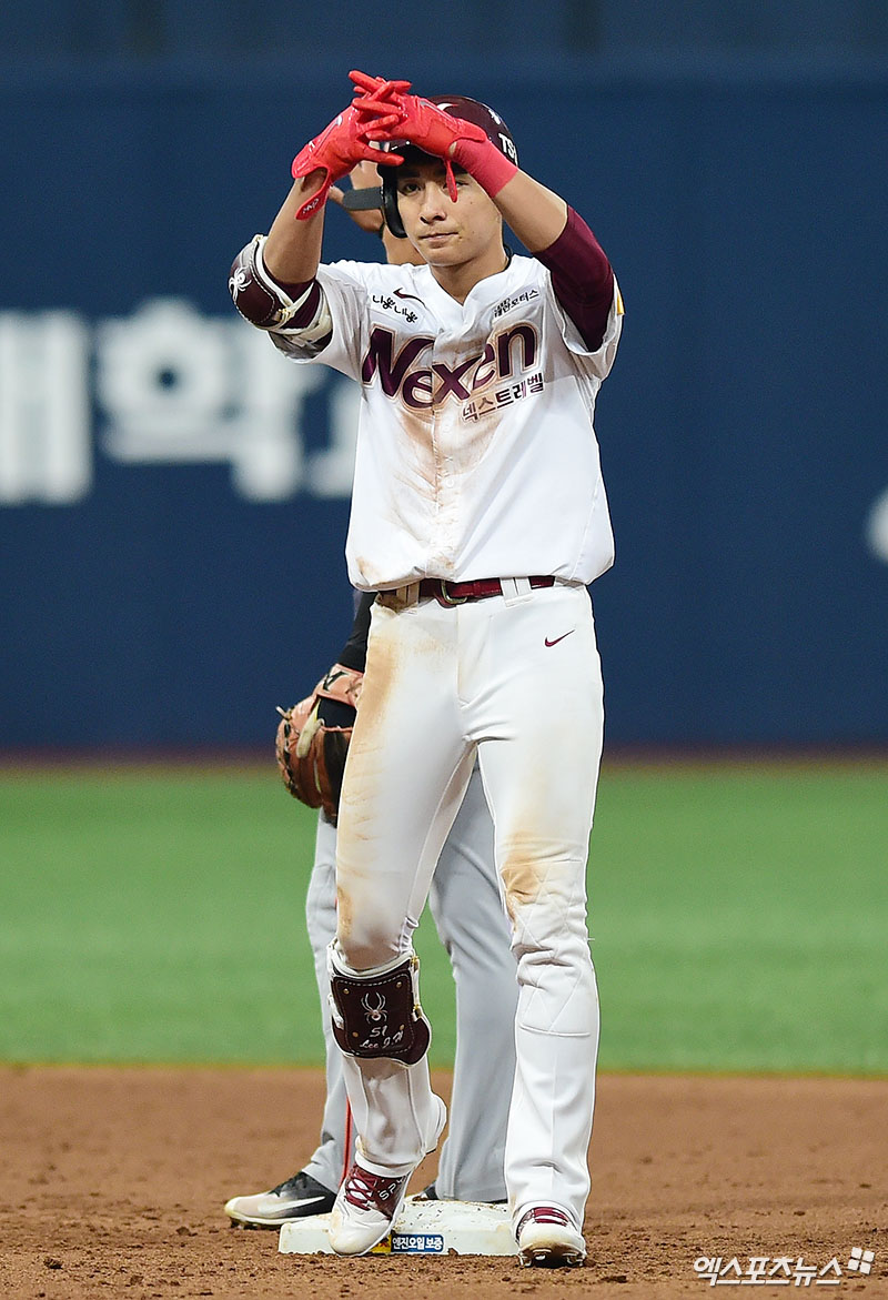 [엑스포츠뉴스 박지영 기자] 24일 오후 고척스카이돔에서 열린 '2018 신한은행 MY CAR KBO리그' 한화 이글스와 넥센 히어로즈의 개막전 경기, 7회말 무사 넥센 이정후가 2루타를 때려낸 뒤 2루에서 세리머니를 하고 있다.
