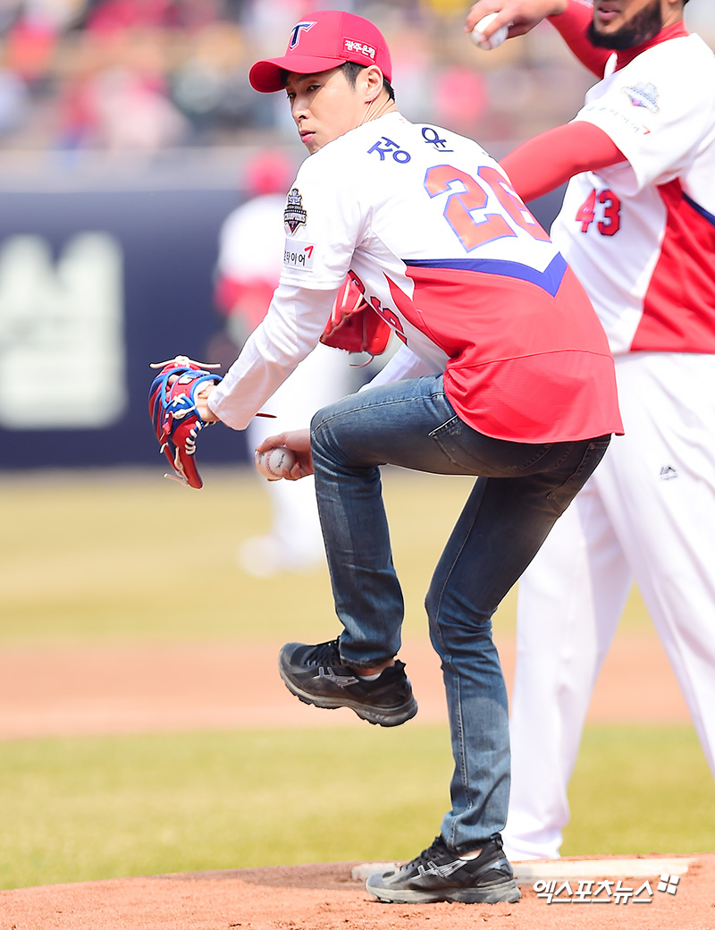 [엑스포츠뉴스 광주, 김한준 기자] 24일 오후 광주-기아 챔피언스필드에서 열린 '2018 신한은행 MY CAR KBO리그' kt 위즈와 KIA 타이거즈의 개막전 경기, 동방신기 유노윤호가 시구에 임하고 있다.