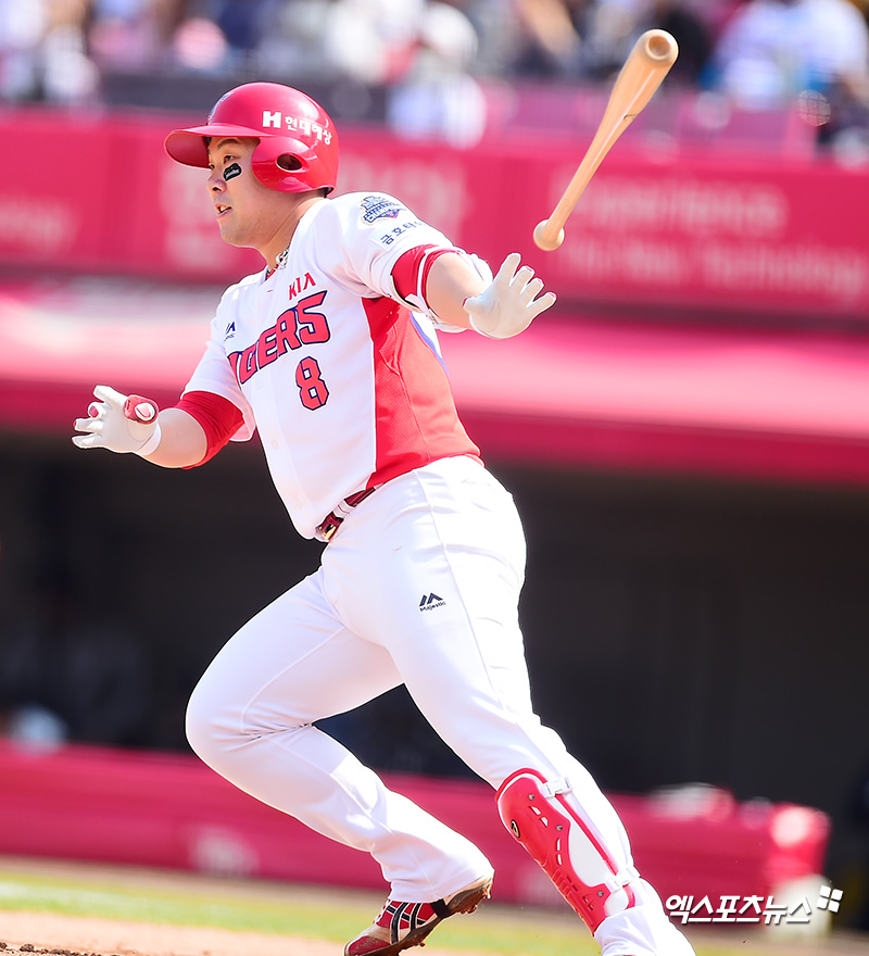 [엑스포츠뉴스 광주, 김한준 기자] 25일 오후 광주-기아 챔피언스필드에서 열린 '2018 신한은행 MY CAR KBO리그' kt 위즈와 KIA 타이거즈의 경기, 1회말 1사 1,2루 KIA 안치홍이 1타점 적시타를 날리고 있다.