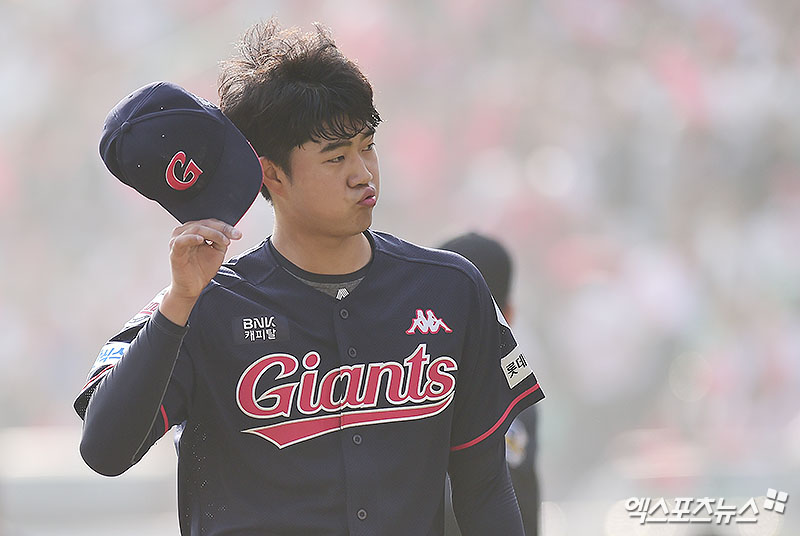 [엑스포츠뉴스 인천, 박지영 기자] 25일 오후 인천SK행복드림구장에서 열린 '2018 신핸은행 MYCAR KBO리그' 롯데 자이언츠와 SK 와이번스의 경기, 5회말 2사 3루 롯데 선발투수 윤성빈이 SK 로맥을 중견수 플라이 아웃으로 잡아내며 이닝 종료시킨 뒤 더그아웃으로 향하고 있다.