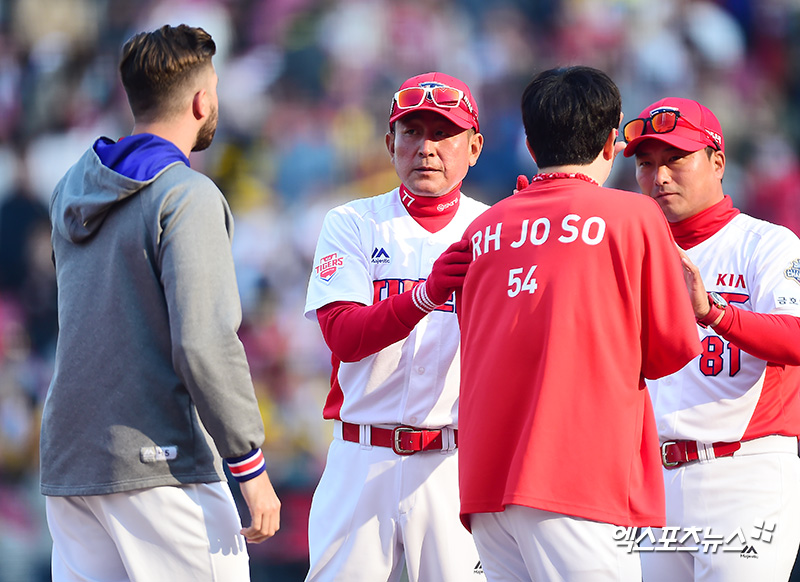 이날 경기에서 승리한 KIA 김기태 감독이 양현종과 하이파이브를 하고 있다.