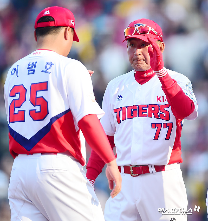 이날 경기에서 승리한 KIA 김기태 감독이 이범호와 하이파이브를 하고 있다.