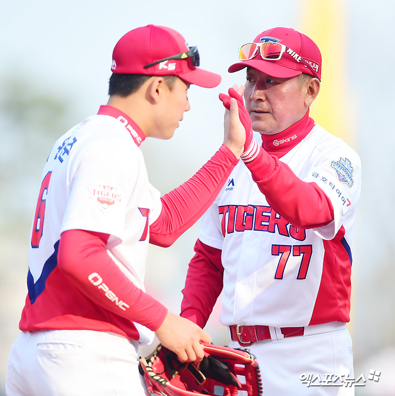 이날 경기에서 승리한 KIA 김기태 감독이 최원준과 하이파이브를 하고 있다.