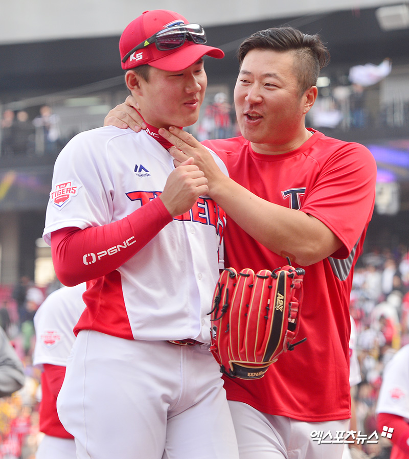 이날 경기에서 승리한 KIA 최형우와 최원준이 장난을 치며 더그아웃으로 향하고 있다.