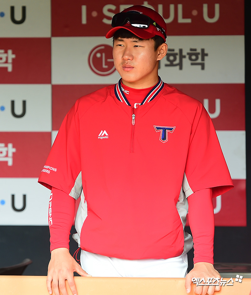 [엑스포츠뉴스 김한준 기자] 30일 오후 서울 송파구 잠실야구장에서 열리는 '2018 신한은행 MY CAR KBO리그' KIA 타이거즈와 LG 트윈스의 경기, KIA 최원준이 LG 선수들의 훈련을 지켜보고 있다.