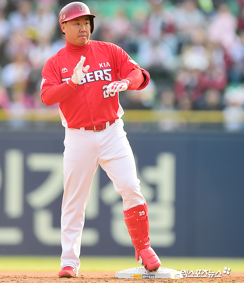 [엑스포츠뉴스 김한준 기자] 31일 오후 서울 송파구 잠실야구장에서 열린 '2018 신한은행 MY CAR KBO리그' KIA 타이거즈와 LG 트윈스의 경기, 2회초 1사 1루 KIA 이범호가 1타점 2루타를 날린 후 타임을 요청하고 있다.