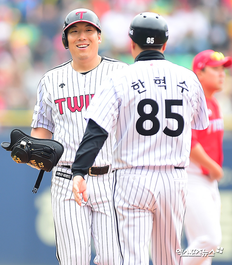 [엑스포츠뉴스 김한준 기자] 1일 오후 서울 송파구 잠실야구장에서 열린 '2018 신한은행 MY CAR KBO리그' KIA 타이거즈와 LG 트윈스의 경기, 1회말 무사 1루 LG 김현수가 좌중간 2루타를 날린 후 한혁수 코치와 하이파이브를 하고 있다.