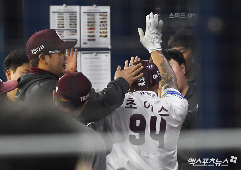 [엑스포츠뉴스 박지영 기자] 5일 오후 서울 구로구 고척스카이돔에서 열린 '2018 신한은행 MY CAR KBO리그' kt 위즈와 넥센 히어로즈의 경기, 2회말 무사 넥센 초이스가 좌월 솔로홈런을 터뜨린 뒤 더그아웃에서 동료들과 하이파이브를 나누고 있다.