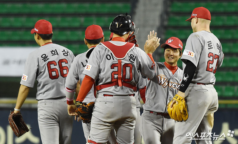 경기 종료 후 SK 선수들이 마운드에 모여 하이파이브를 나누고 있다.
