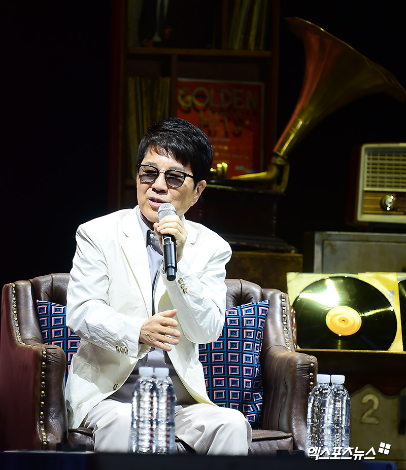 [엑스포츠뉴스 김한준 기자] 11일 오후 서울 한남동 블루스퀘어 아이마켓홀에서 열린 조용필 50주년 기자간담회 '차 한잔 할까요?'에 참석한 조용필이 토크를 나누고 있다.