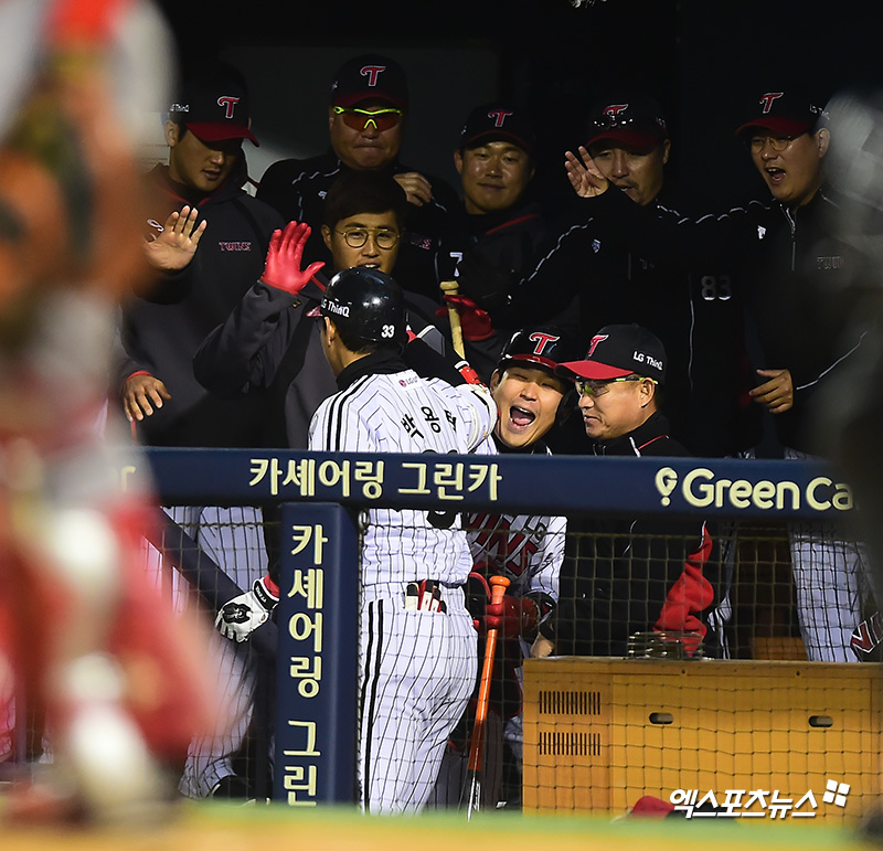[엑스포츠뉴스 김한준 기자] 11일 오후 서울 송파구 잠실야구장에서 열린 '2018 신한은행 MY CAR KBO리그' SK 와이번스와 LG 트윈스의 경기, 6회말 LG 박용택이 솔로 홈런을 날린 후 더그아웃에서 하이파이브를 하고 있다.