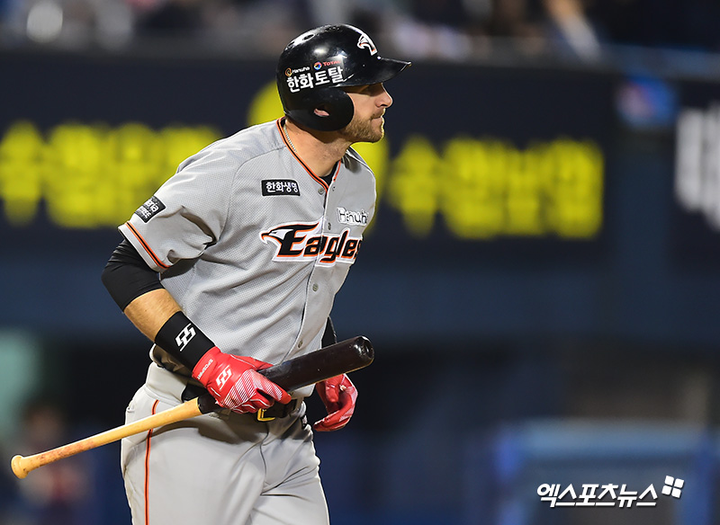 [엑스포츠뉴스 김한준 기자] 19일 오후 서울 송파구 잠실야구장에서 열린 '2018 신한은행 MY CAR KBO리그' 한화 이글스와 두산 베어스의 경기, 8회초 1사 1루 한화 호잉이 타격을 한 후 실망스러운 표정을 보이고 있다. 결과는 유격수 플라이 아웃.