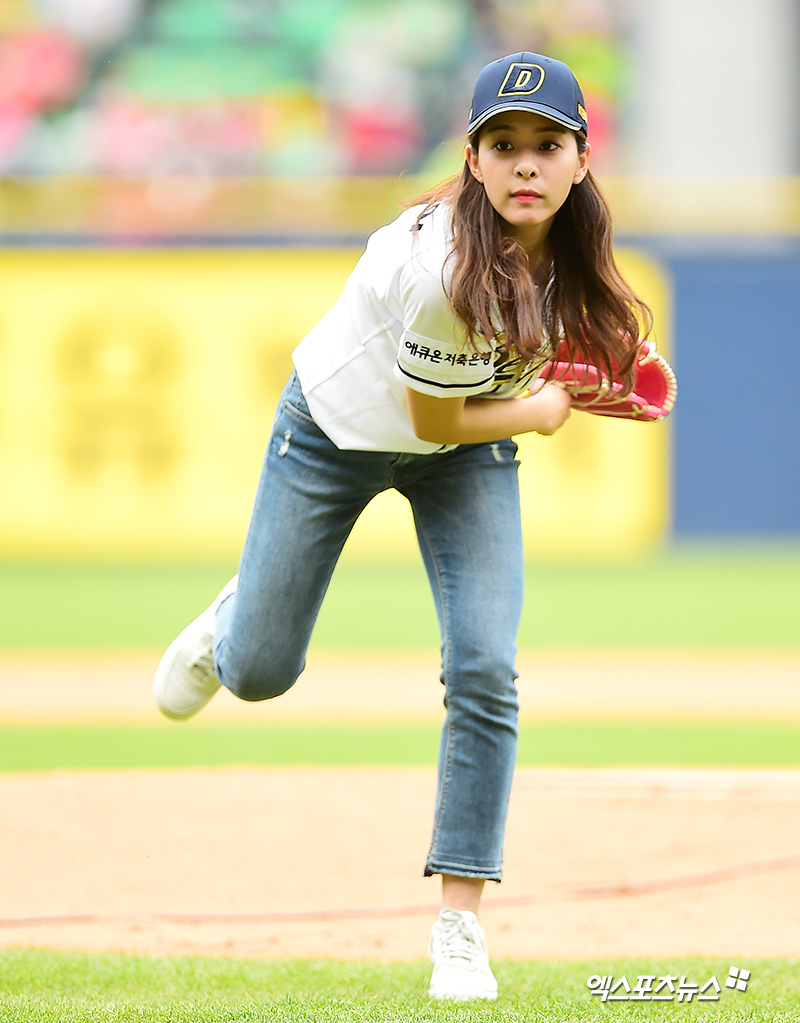 [엑스포츠뉴스 잠실, 김한준 기자] 22일 오후 서울 송파구 잠실야구장에서 열린 '2018 신한은행 MY CAR KBO리그' KIA 타이거즈와 두산 베어스의 경기, 배우 설인아가 시구에 임하고 있다.