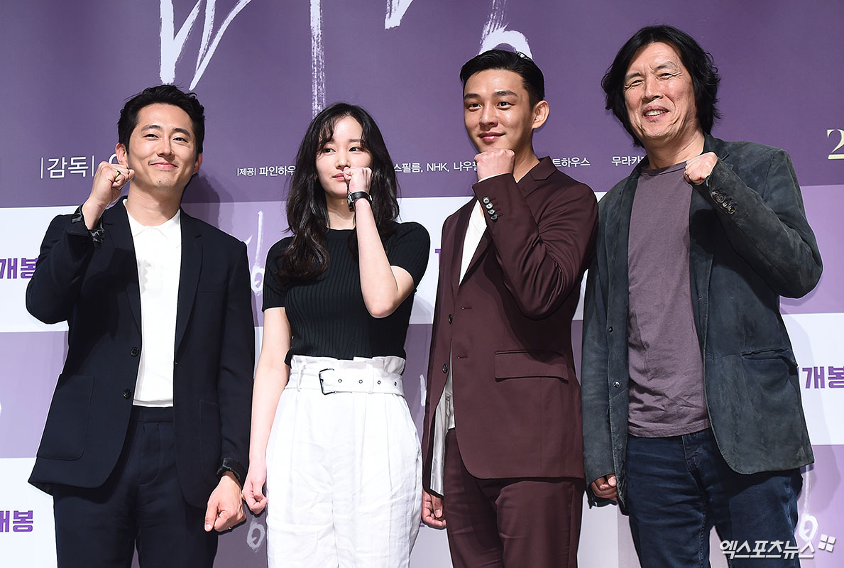 [엑스포츠뉴스 박지영 기자] 24일 오전 서울 신사동 CGV 압구정점에서 열린 영화 '버닝' 제작보고회에 참석한 배우 스티븐 연, 전종서, 유아인, 이창동 감독이 포토타임을 갖고 있다.